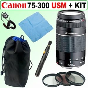 This compact and lightweight EF 75-300mm 4x telephoto zoom lens is ideal for shooting sports, portraits, and wildlife. The lens is distinguished by a newly developed micro ultra-sonic monitor (USM) that makes autofocusing quicker and quieter, along with an improved zoom mechanism that includes a silver ring on the front for a luxurious touch. The micro USM makes this version of the lens particularly suitable for applications that require a fast autofocus, such as sporting events or wildlife shoots. Best of all, the USM version shares many of the same features that makes the non-USM lens so popular, such as a compact size, a close focusing range, and accessory compatibility. Focal length: 75-300mm Maximum aperture: 1:4.5-5.6 Lens construction: 13 elements in 9 groups Diagonal angle of view: 32 degrees (at 11 feet) to 8 degrees (at 15 feet) Focus adjustment: Front group rotating extension system with USM Closest focusing distance: 4.9 feet Zoom system: Rotating type Filter size: 58mm Dimensions: 2.8 inches in diameter, 4.8 inches long.Deluxe Accessory Kit 3 pc Filter Kit: UV/ Polarizing filter/Fluorescent correction and Case - Protective Telephoto Lens Pouch with Drawstring Closure - Cap Keeper Front Lens Cap Leash - Lens Pen Cleaning Tool - Advanced Micro Fiber Cleaning Cloth.
