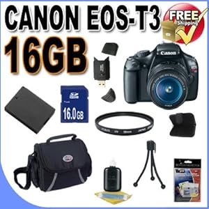 Kit Includes!1- Canon EOS Rebel T3 12.2 MP CMOS Digital SLR with 18-55mm IS II Lens USA w/ All Supplied Accessories1- 16GB SDHC Memory Card (Don't Miss a Memory!)1- USB SDHC Memory Card Reader (Download Images Quicker!)1- Lithium Ion High Capacity Battery (Great for Vacation!)1- UV Filter (Protect Your Lens!)1- Shock Proof Case (Protect Your Camera!)1- Memory Card Wallet (Protect Your Photos!)1- Pack of LCD Screen Protectors (Protect from Dust And Scratches!)1- Lens/LCD Cleaning Kit1- Mini Table Size TripodMore About This Camera!The Canon T3 Kit includes the EOS Rebel T3 Digital SLR Camera and the EF-S 18-55mm f/3.5-5.6 IS type II Lens. This camera and lens is perfect for photographers ready to make the move to digital SLR photography. The EOS Rebel T3 delivers beautiful photos and video, speed, simplicity and fun. It features a 12.2 Megapixel CMOS Image Sensor and Canon DIGIC 4 Image Processor for richly detailed images and quick camera response. It has Canon's amazing 63-zone, dual-layer metering for accurate exposures and features Canon's Basic+ function, HD video recording and Live View shooting, plus a convenient in-camera Feature Guide.
